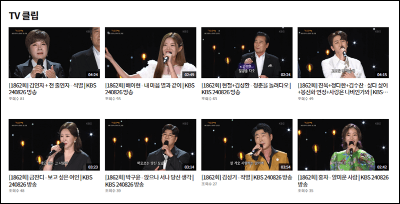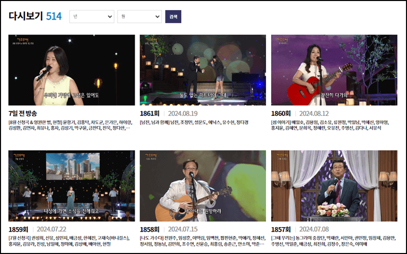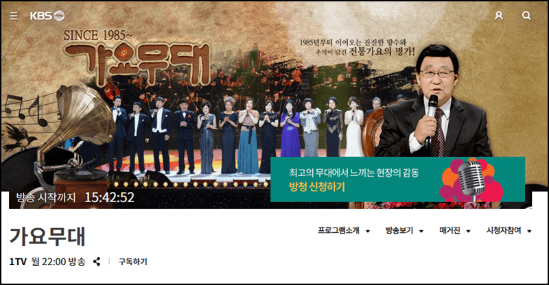 가요무대 방송 시간을 놓치셨거나, 한 번만 보기는 아쉬워 다시 보고 싶으신 분들도 계시죠? 특히 내가 좋아하는 가수분이 출연하셨거나, 내가 좋아하는 노래가 나왔을 때 또 보고 싶다는 생각이 드실 텐데요. 가요무대 방송을 다시 시청하실 수 있도록 바로 안내해 드릴게요.