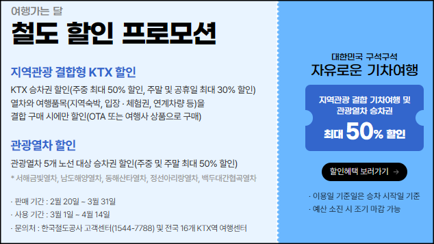 대한민국 구석구석 국내여행을 활성화시키기 위한 여행전문 홈페이지 여행 가는 달에서는 철도할인, 숙박할인, 여행상품 정보등을 제공합니다. 먼저 여행가는 달의 철도할인 프로모션부터 소개할게요. 지역관광 결합형 KTX할인이 주중 최대 50%까지 할인이 됩니다.