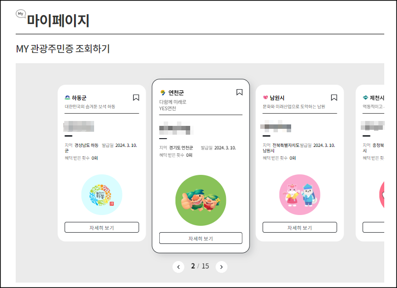 디지털 관광주민증은 복수 선택가능하며 대한민국 구석구석 홈페이지나 대한민국 구석구석앱 마이페이지에서 나의 관광주민증을 조회할 수 있습니다.