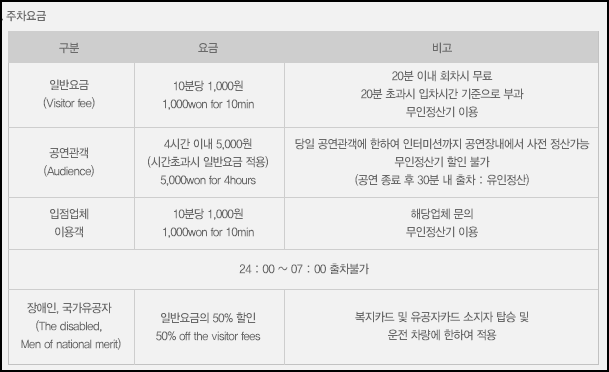 주차 사전정산은 신한카드홀 객석 1층 물품보관소 내 주차정산 창구에서 하실 수 있습니다. 주차 사전정산은 공연시작 1시간 전부터 가능합니다. 공연관람객의 경우 4시간에 5,000원 차량번호를 등록해 줍니다. 4시간이 초과할 시 10분당 1,000원이 부과됩니다.