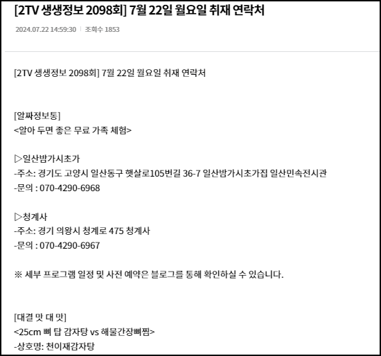 생생정보 방송에 소개된 모든 여행지와 맛집 정보는 생생정보 홈페이지 > 알려드립니다 페이지에서 확인이 가능합니다. 오늘 방송이 7월 22일이니 7월 22일 월요일 취재 연락처를 클릭하시면 소개된 맛집과 여행지 정보를 모두 확인하실 수 있습니다.