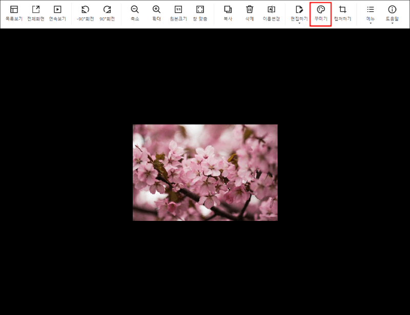 알씨 이미지 뷰어를 실행하시면 위 메뉴에 축소, 확대, 사이즈 설정, 목사, 이름변경, 편집하기, 꾸미기, 캡처하기 등 다양한 메뉴를 사용하실 수 있습니다. 더 상세하기 꾸미기를 원하시는 분들은 꾸미기를 눌러줍니다.