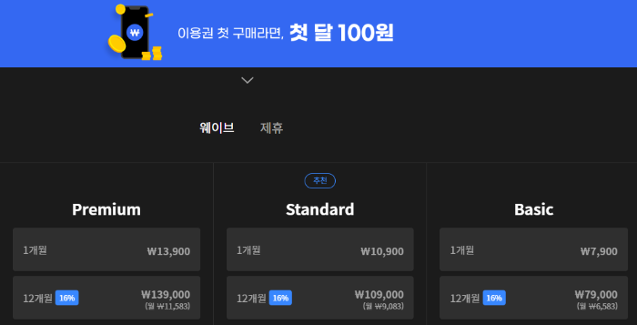 웨이브 요금제는 다양하게 있으니, 원하는 요금제를 선택해 이용할 수 있습니다. 1개월만 가입할수도 있고, 12개월 가입하면 16% 할인을 받을 수 있습니다. BASIC요금제1개월에 7,900원에 이용할 수 있습니다.