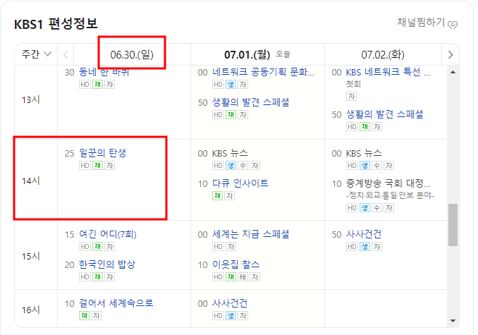 혹시 편성정보가 바뀔 수도 있으니 KBS1 편성표의 일요일 오후 시간대를 잘 확인하셔서 재방송을 놓치시는 일이 없도록 하시길 바랍니다. KBS1 편성 정보를 확인하실 수 있도록 바로 안내해 드리겠습니다.