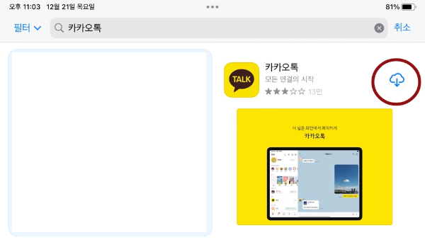 1. 앱스토어에서 카카오톡을 검색해, 카카오톡을 다운받습니다.