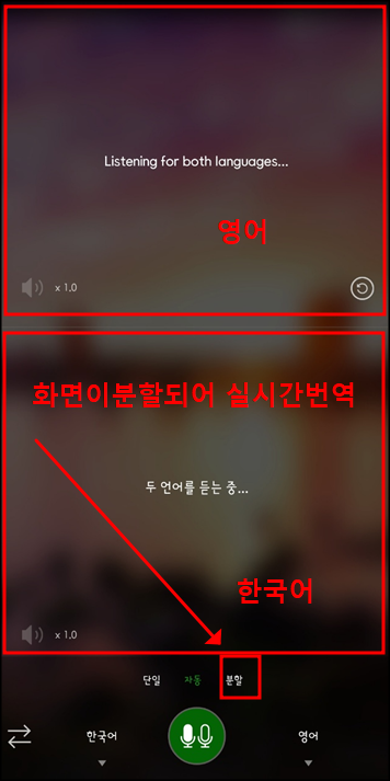 앱을 다운로드하신 후 실행하셔서 한국어로 말하거나, 하고 싶은 말을 한국어로 치시면 바로 영어로 실시간 번역되어 나와 편리합니다.