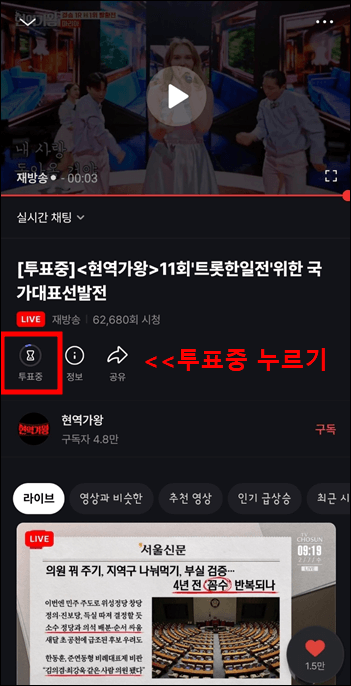 먼저 네이버 나우를 검색하셔서 설치합니다 >>  현역가왕을 검색해 현역가왕을 찾아 [투표중]화면을 누릅니다. >> 그다음 모래시계모양 [투표중]을 누릅니다. >>3인을 선택하고 >> 투표하기를 누릅니다.